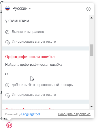 При проверке русского языка расширение не проверяет такие проблемы как длинное/короткое тире, кавычки, е или ё. Если текст после LanguageTool проверить в Орфограммке, то она найдёт массу стилистических и типографических ошибок. Иногда даже орфографические ошибки находятся не всё.