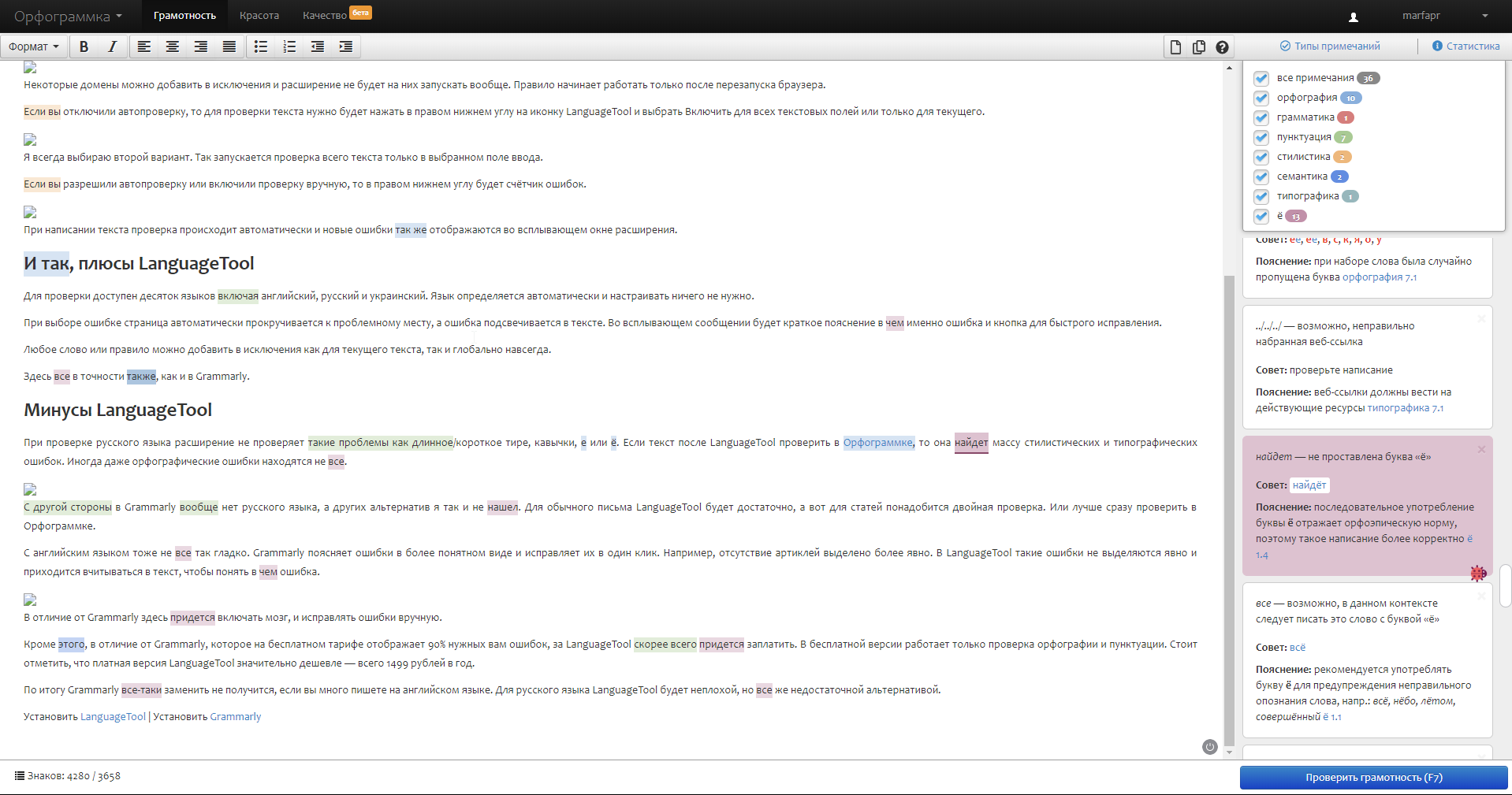 С другой стороны, в Grammarly вообще нет русского языка, а других альтернатив я так и не нашёл. Для обычного письма LanguageTool будет достаточно, а вот для статей понадобится двойная проверка. Или лучше сразу проверить в Орфограммке.