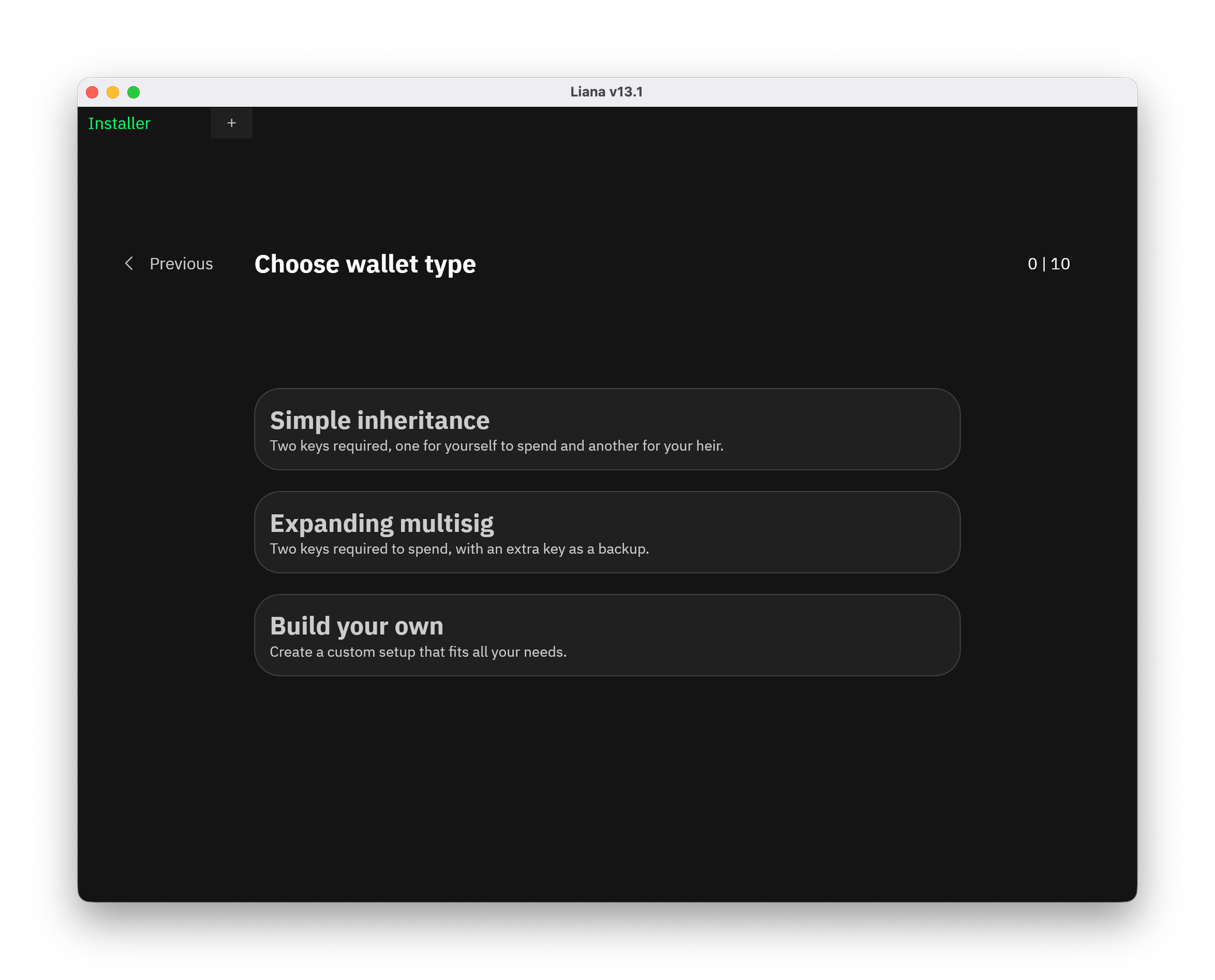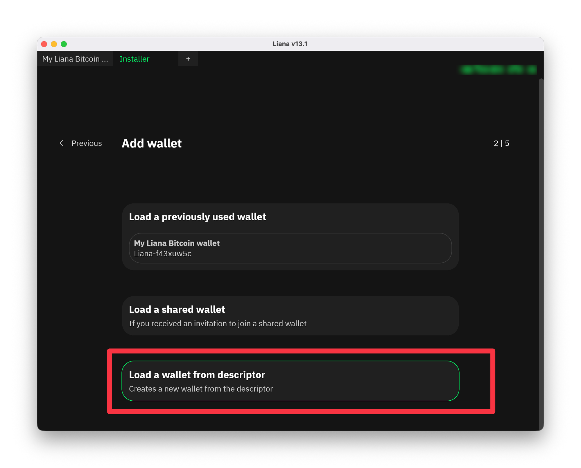 Чтобы получить доступ по ключу наследования, вам нужно точно так же начать создание нового кошелька в Liana. Но на шаге подключения к кошельку выбрать пункт Load a wallet from descriptor, а затем выбрать способ восстановления кошелька.