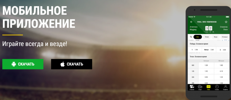Сейчас любая сколь-нибудь серьезная букмекерская контора предлагает своим клиентам скачать установить мобильное приложение, и делать ставки через него. Среди легальных российских букмекерских контор лучшие мобильные приложения для Андроид и iOS предоставляют Париматч (parimatch.ru), Винлайн (winline.ru), 1хСтавка (1xstavka.ru), Фонбет (fonbet.ru), Леон (leon.ru).