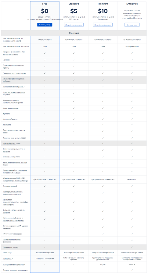 - Для очень больших команд — обратитесь в отдел продаж Confluence.