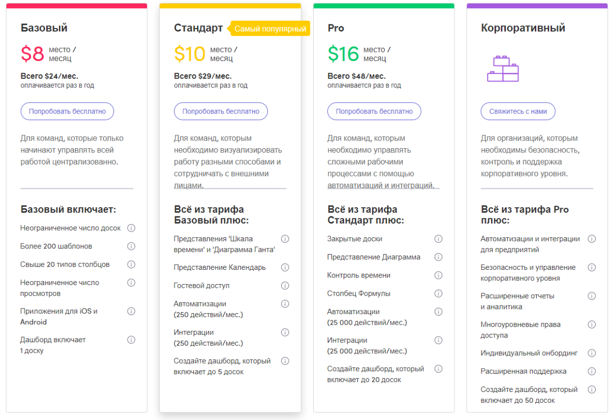 monday предлагает четыре тарифных плана: Базовый, Стандартный, Профессиональный и Корпоративный. Цены, показанные на скриншоте, сформированы для команды из пяти пользователей.