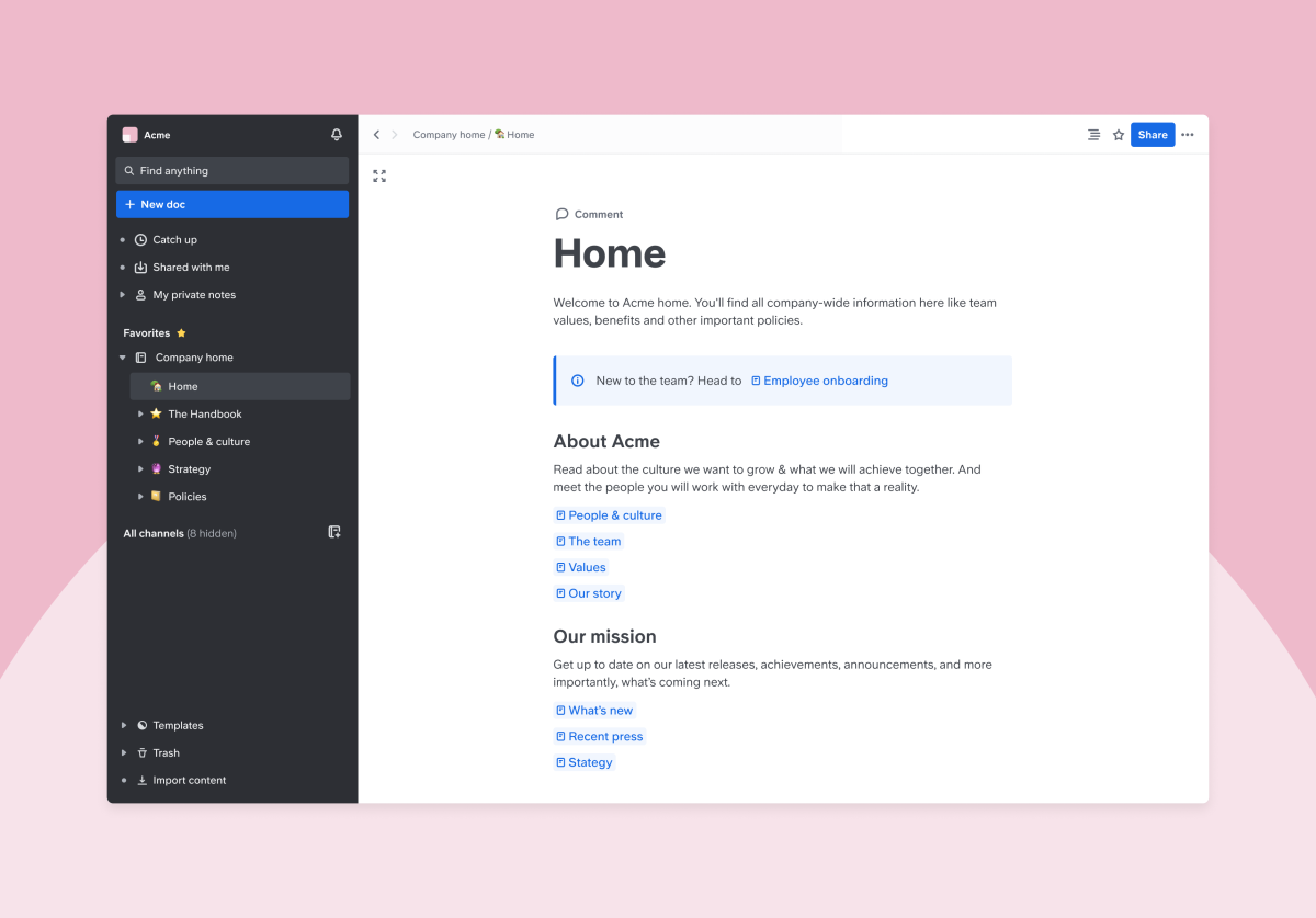 Это платформа, позволяющая членам команды делиться своими знаниями и совместно работать над проектами. Со Slite вы можете уделять больше внимания написанию, а не форматированию. Делитесь своими заметками и файлами за пределами команды с помощью различных функций экспорта.