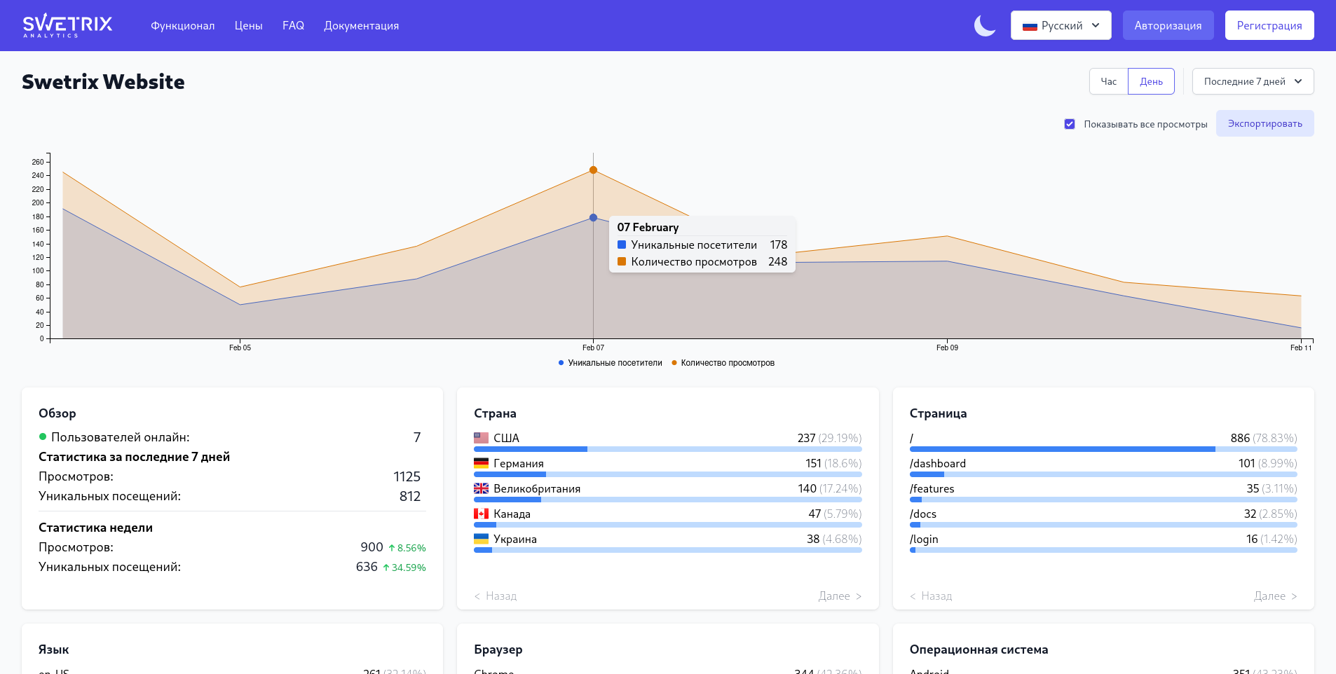Swetrix это сервис веб-аналитики с открытым исходным кодом, который позволяет отслеживать широкий спектр метрик, автоматически получать отчёты посещаемости на электронную почту, просматривать статистику посещаемости в реальном времени и многое другое.