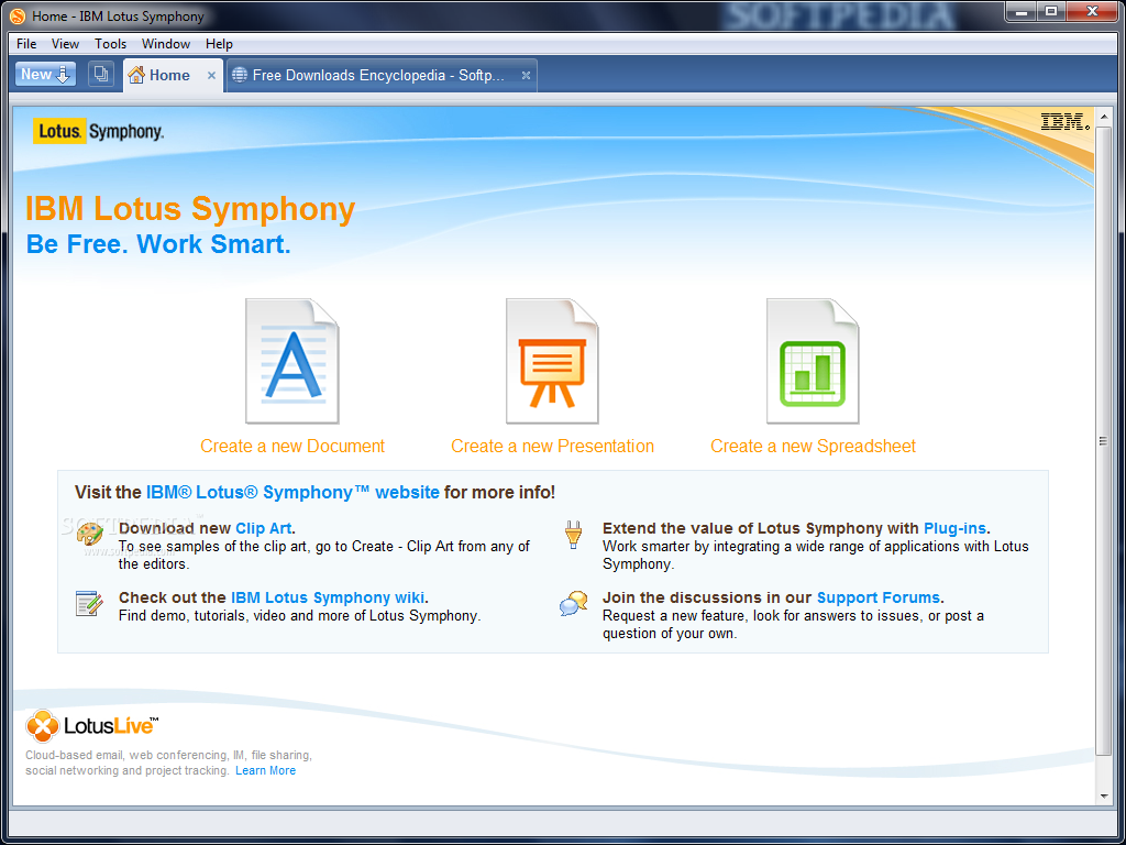 Lotus Symphony — это бесплатный офисный пакет от IBM, который содержит в себе всё, что вам может понадобиться для повседневной работы. Загрузите программное обеспечение здесь и наслаждайтесь работой быстрого и эффективного текстового редактора с электронными таблицами и программой для создания презентаций. В Lotus Symphony найдётся замена всем компонентам Microsoft Office. Благодаря открытому формату ODF вы можете легко получить доступ ко всем файлам, без проблем редактировать и сохранять их.