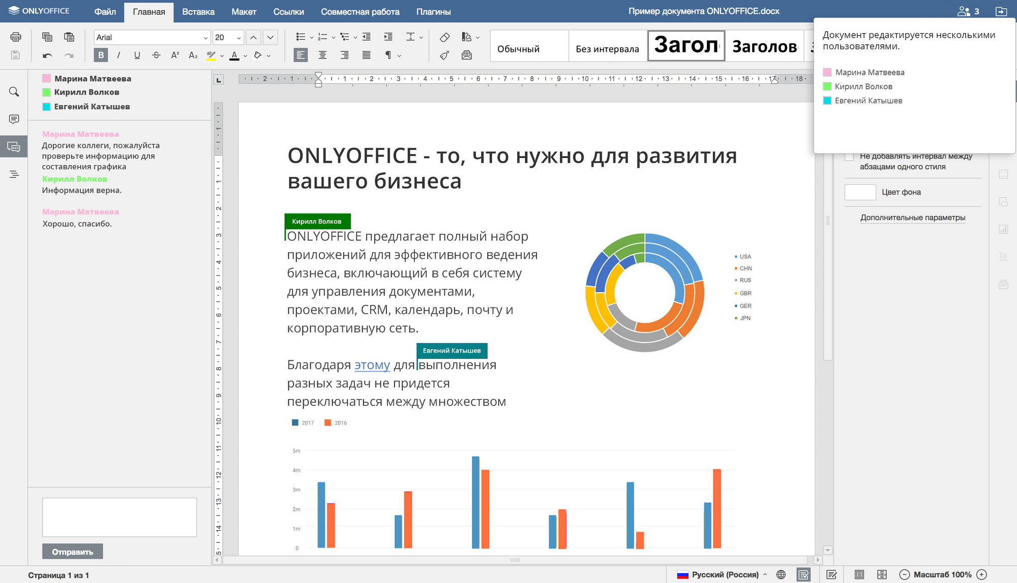 TeamLab Office имеет бесплатную версию, которая позволяет делать всё, что необходимо среднестатистическому пользователю, и предполагает как личное, так и коммерческое использование. Это программное обеспечение предлагает уникальные функции форматирования и облачное хранилище. TeamLab Office также поддерживает HTML5, тем самым расширяя свою пользовательскую аудиторию. Данный офисный пакет позволяет плавно переключаться между разными форматами файлов. Наслаждайтесь редактором документов, редактором электронных таблиц и редактором презентаций — всё это бесплатно.