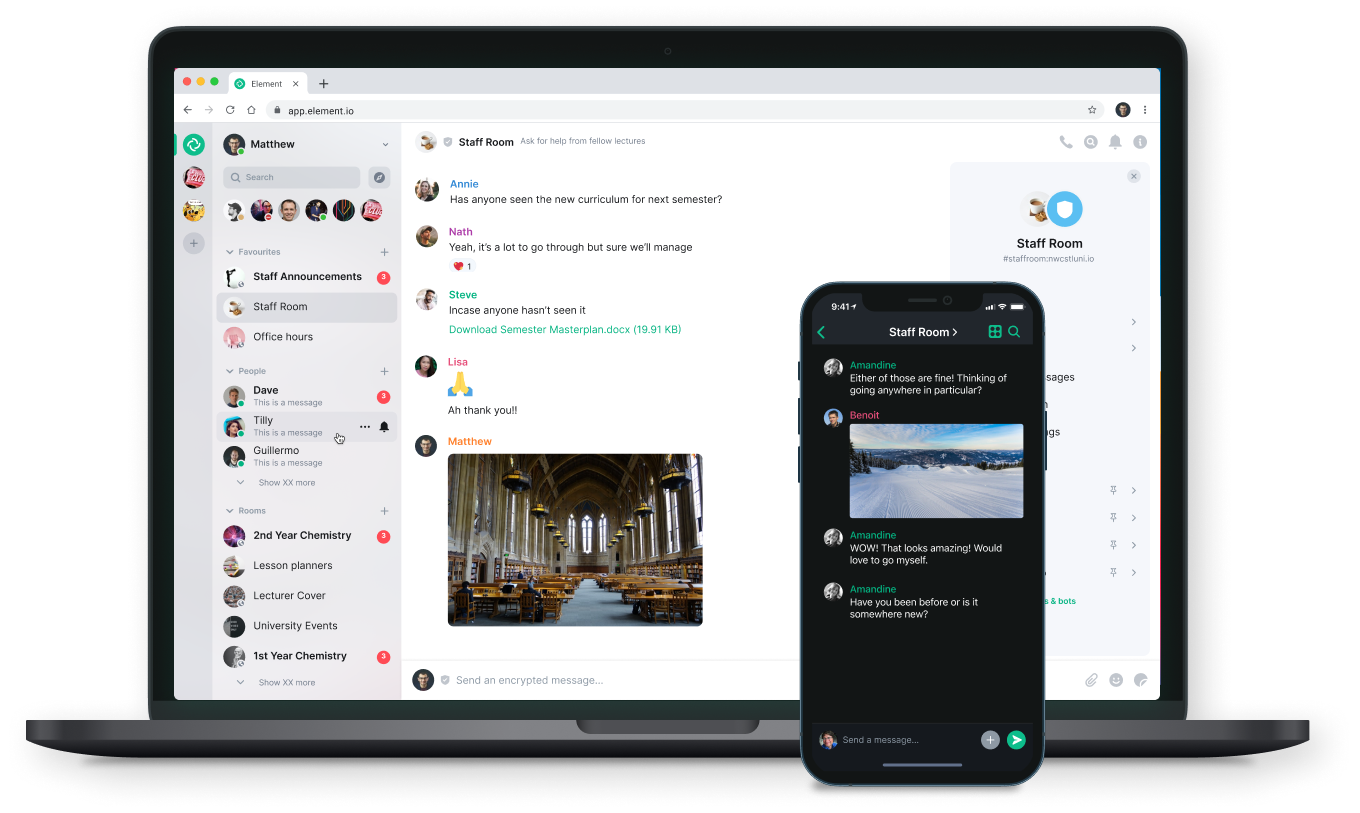 Также вы сможете общаться со своими друзьями из Matrix, даже если они пользуются совсем другим мессенджером.