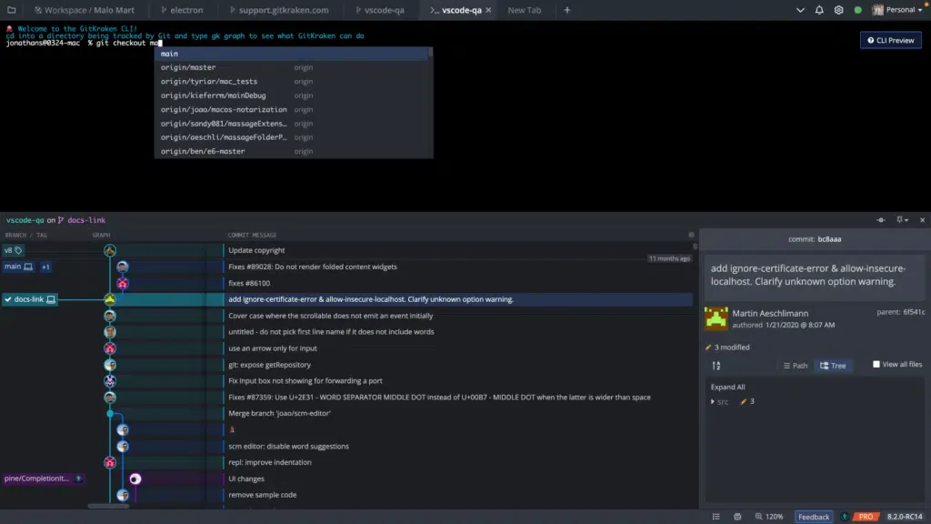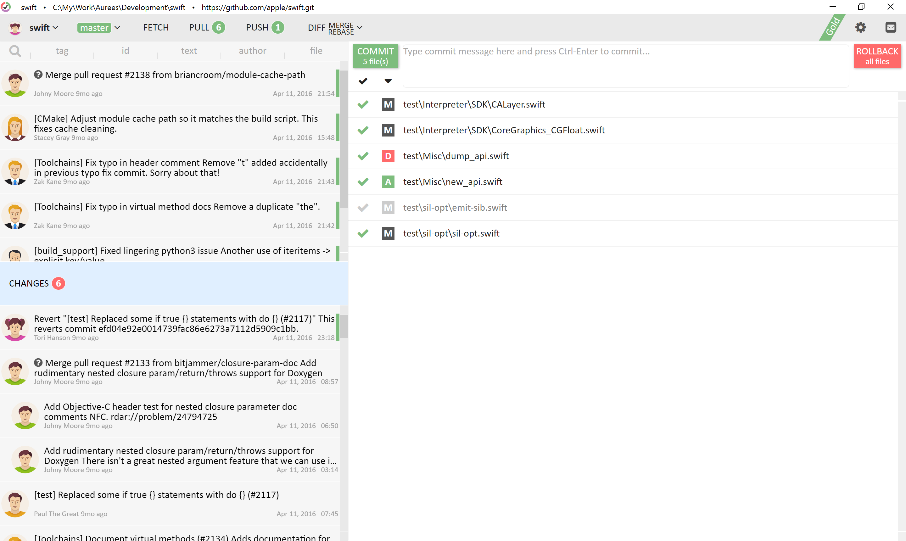 Благодаря эстетичному интерфейсу вы получаете прямой доступ к потокам Git. Вы можете воспользоваться локальным поиском по commits, управлять удалёнными репозиториями, интерактивным rebase, работать с большими файлами. Каждый процесс вы увидите в наглядной форме, что крайне упрощает его восприятие.
