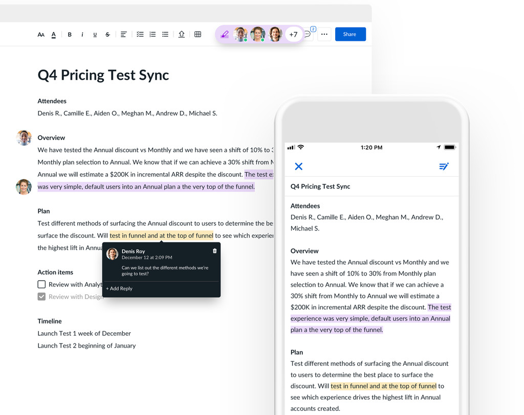 Круто, что вы можете работать с любым количеством человек одновременно и хранить любое количество документов в Box Drive. Все вносимые в документ правки сохраняются автоматически, а чтобы не произошла путаница в правках, каждому участнику будет присвоен свой цвет.