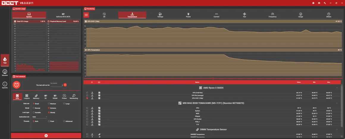 OCCT отлично справляется с тестированием ЦП, выявляя проблемы со стабильностью. Можно оставить параметры по умолчанию (небольшой набор данных, экстремальный режим, постепенная загрузка, автоматический набор команд и т.д.) и запустить тест примерно на час. Ещё есть встроенный тест Linpack, но он более требователен к процессору и не так хорошо обнаруживает ошибки.
