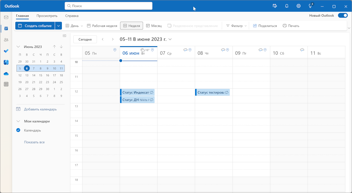 На левой панели отображается ежемесячник и список всех активных календарей. А справа можно посмотреть все мероприятия на выбранный день с разделением на день, неделю, месяц или год.