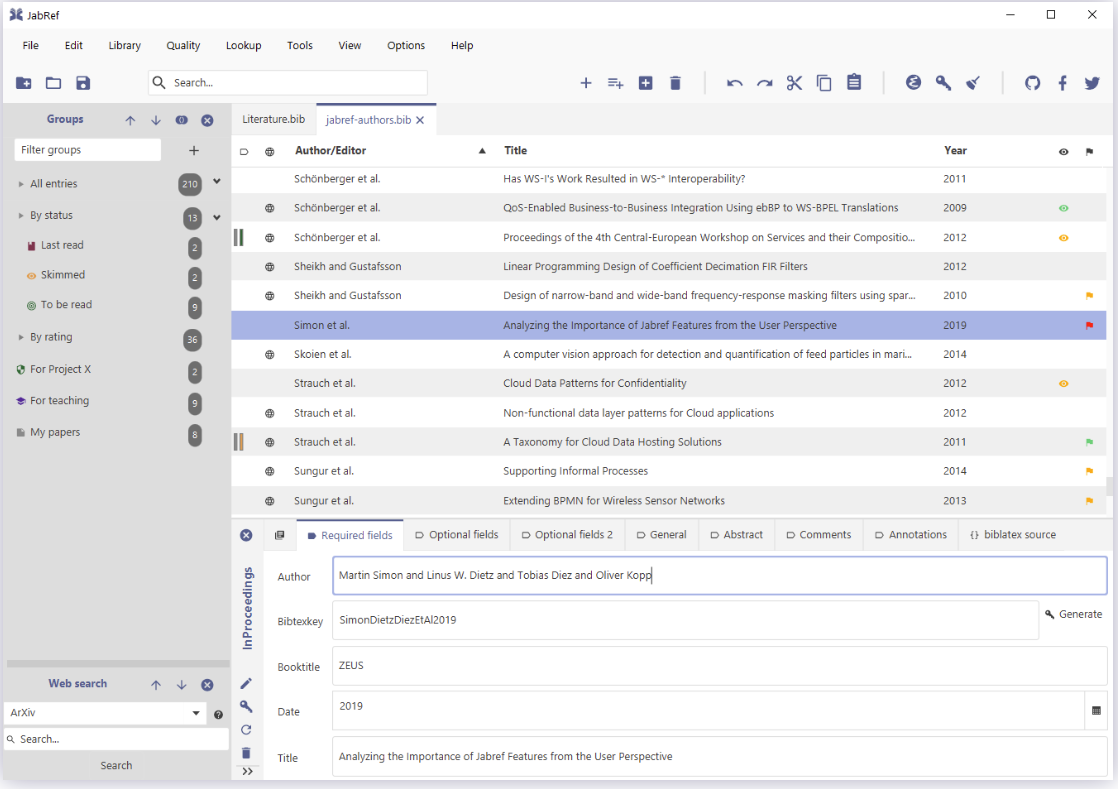 А эта утилита заточена специально под управление библиотекой ссылок из BibTex и Biblatex. Позволяет добавлять файлы в таких форматах, как BIB, TXT, PDF, XML и пр. Есть возможность поиска ссылок по сервисам ACMPortal, Google Scholar, IEEEXplore, Springer, INSPIRE и т.д. Можно даже подключаться к базам данных, вроде Oracle, MySQL, PostgreSQL.
