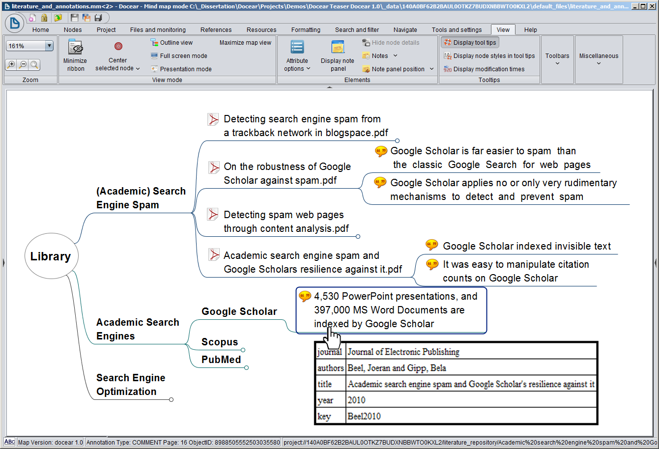 Есть возможность визуализировать данные в виде интеллект-карт. Есть встроенный браузер для поиска ссылок по Google Scholar, PubMed, IEEE Xplore, Wikipedia и иным источникам.