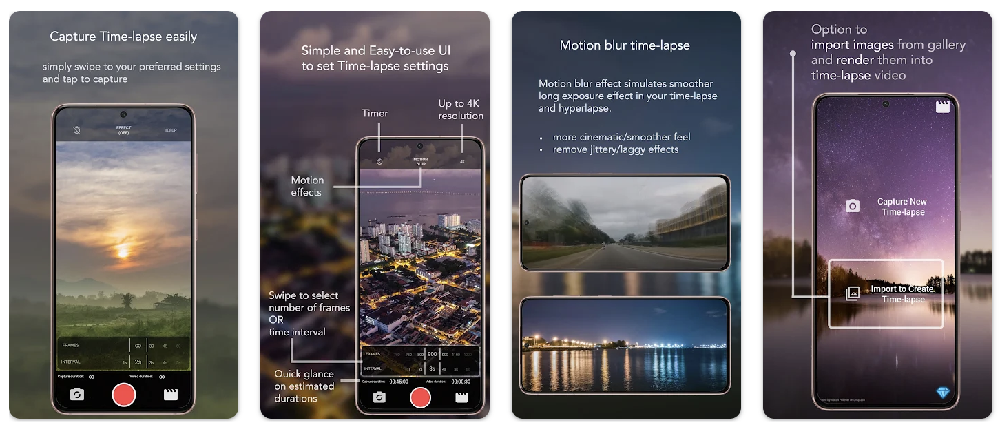 Неплохая приложуха для съёмки таймлапсов и гиперлапсов. Интерфейс простой и содержит минимальное количество кнопок. Также вы можете создавать видео из изображений, которые хранятся в памяти вашего телефона. Есть редактор изображений с базовым набором инструментов.