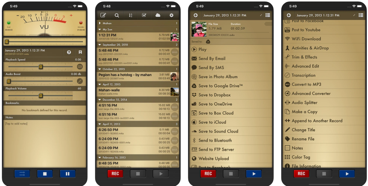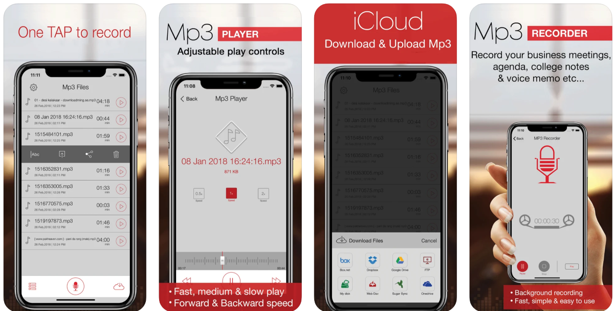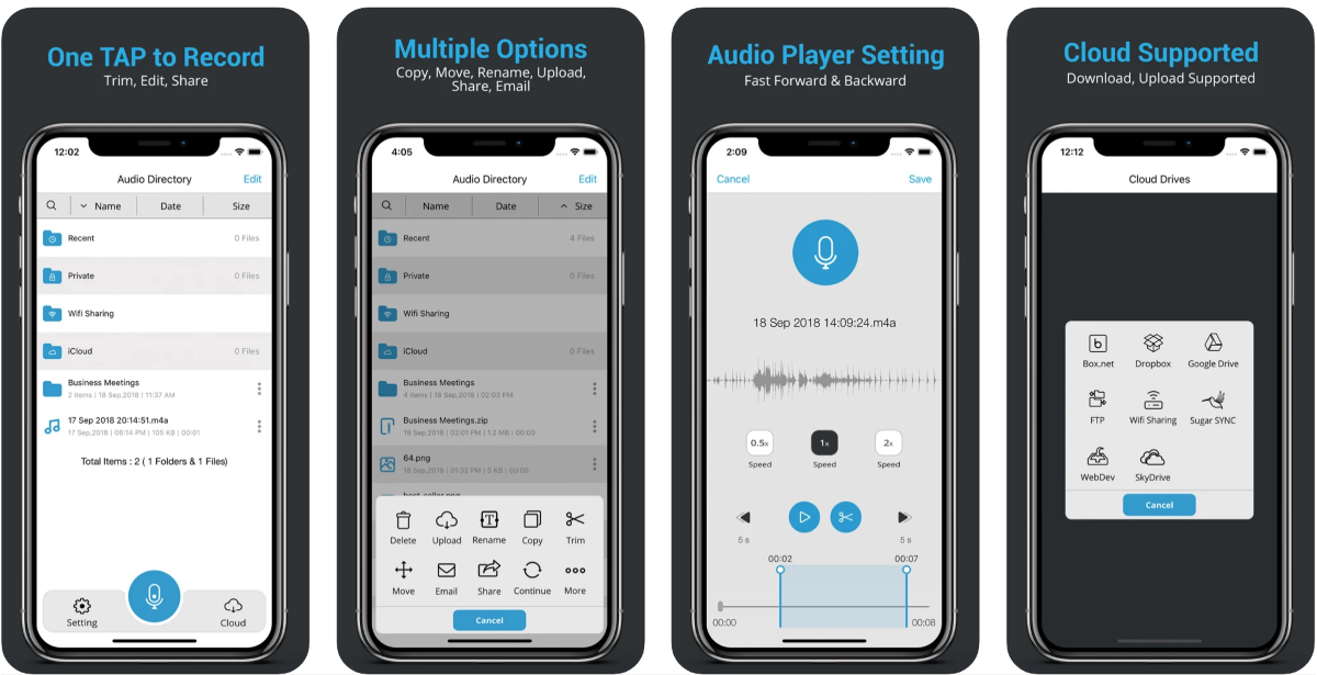 Лёгкое в использовании приложение 2 в 1 (диктофон и аудиоредактор) позволяет записывать аудиозаметки и отправлять их в iCloud Drive, Dropbox, Google Диск, OneDrive, Box и другие облачные хранилки.