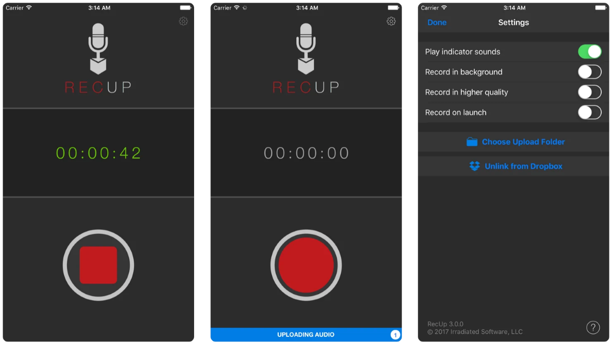 Приложение заточено под запись и отправку голосовых заметок в Dropbox. При этом вам не нужно ничего делать, RecUp сам отправит заметку в хранилище после того, как вы остановите запись.