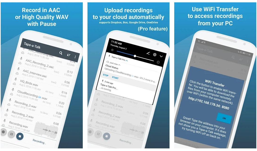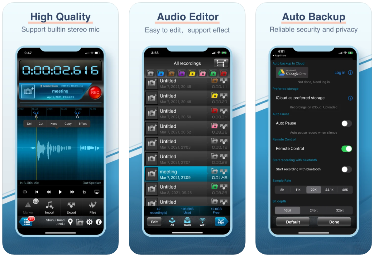 Простой в использовании диктофон с умным интерфейсом. Есть поддержка записи и прослушивания в фоновом режиме. Можно выбрать качество звука (высокое, среднее или низкое) и скорость воспроизведения. И, конечно, можно сохранять свои записи в облаке (поддерживается несколько сервисов).