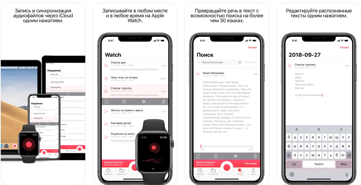 Крутое приложение, умеющее не только записывать вашу речь, но и переводить её в текст (распознаёт более 30 языков). Чтобы начать запись, просто тапните по кнопке включения или используйте голосовую команду Siri.