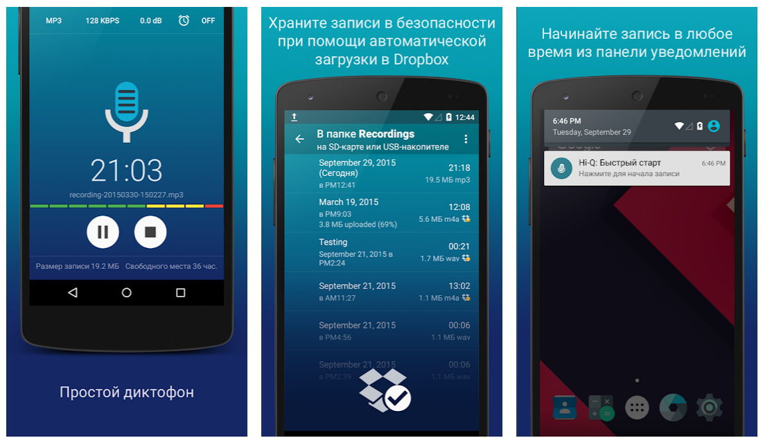Один из самых мощных диктофонов для телефона. Записывает в формате MP3, что позволяет открывать записи практически на любых устройствах. Также есть возможность настроить приложение на автоматическую отправку записей в Dropbox.