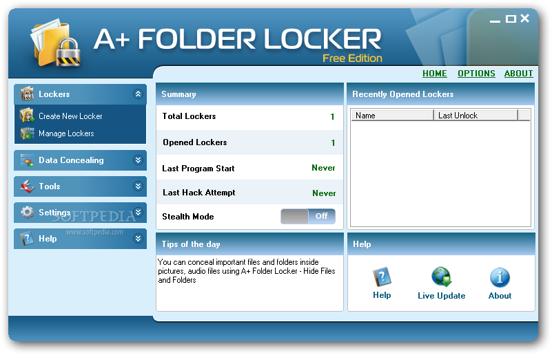 Вы сможете создавать так называемые Locker’ы, т.е. дополнительные диски на своём компьютере (размером до 200 Мб и с файловой системой NTFS по умолчанию) и хранить на них свои файлы и папки. Защитить их можно с помощью пароля или графического ключа. И вы можете применять различные уровни сжатия для таких дисков — низкий, средний или высокий. Ещё вы сможете установить, сколько раз допускается ввести неправильно пароль. И если кто-то превысит этот лимит, то диск будет уничтожен.