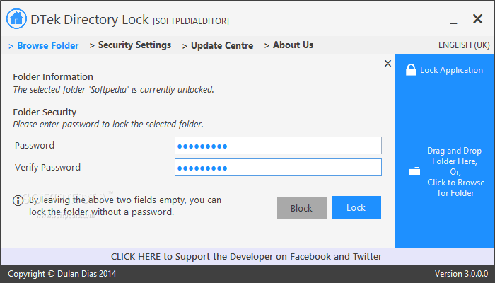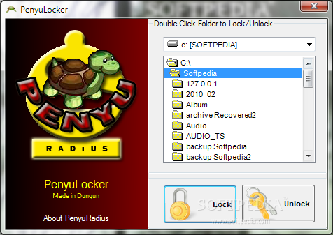 Обычный блокировщик папок. Просто укажите путь к папке (вводится вручную) или перетащите её в окно утилиты и нажмите Lock. Также можно спрятать файлы/папки, установив чекбокс напротив Make files/folders invisible.
