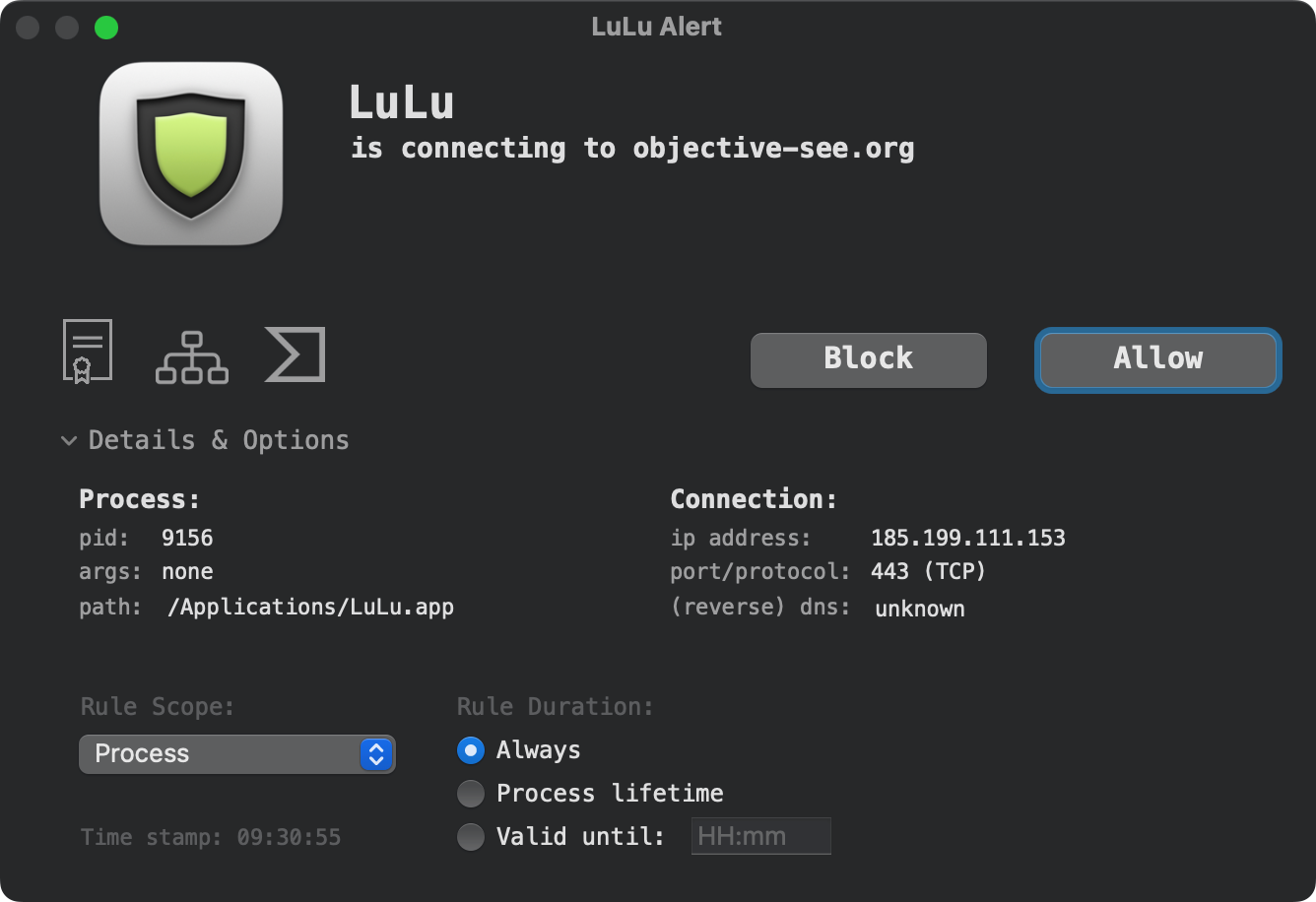 Бесплатный брандмауэр с открытым кодом. По умолчанию он будет пропускать трафик для всех уже установленных приложений и всех приложений Apple. А при обнаружении нового подключения LuLu спросит у вас, какой тип доступа предоставить приложению: постоянный или временный.