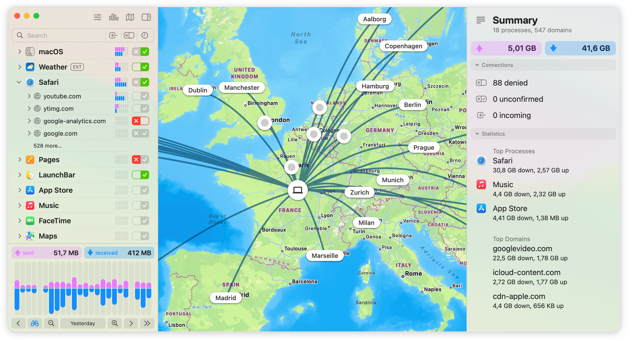 Ещё в Little Snitch есть карты и графики, которые наглядно показывают, куда направляется ваш исходящий трафик (инфа об IP-адресах, портах и протоколах прилагается). Вы можете импортировать списки IP-адресов и доменов уже известных вам злоумышленников, чтобы автоматически блокировать их.