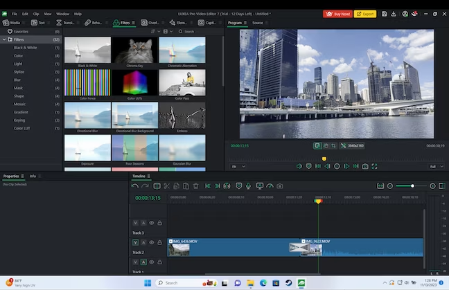 Все переходы, текст, звуковые эффекты, фоны и прочие штуки отличаются высоким качеством. Есть хромакей и стабилизация видео, а также различные фильтры.