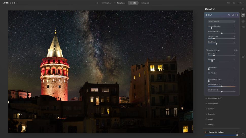 В LuminarAI всего четыре основных вкладки — Catalog, Templates, Editи Export. И их вполне достаточно, на мой взгляд.