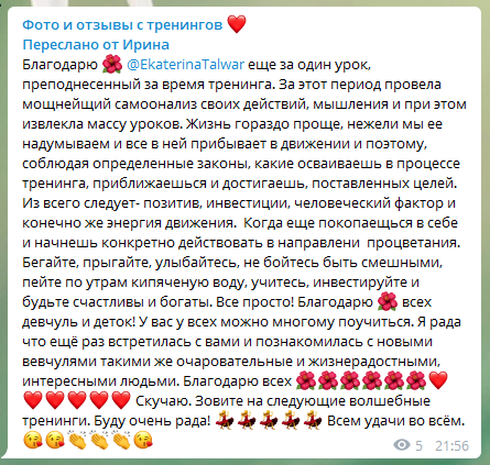 Сами тренинги проводятся в виде вебинаров, общения в чате и даже лично. А у участников остаются положительные впечатления от проведённой работы. Кстати, есть бесплатные тренинги, поэтому не надо говорить, что тут всё только ради денег.