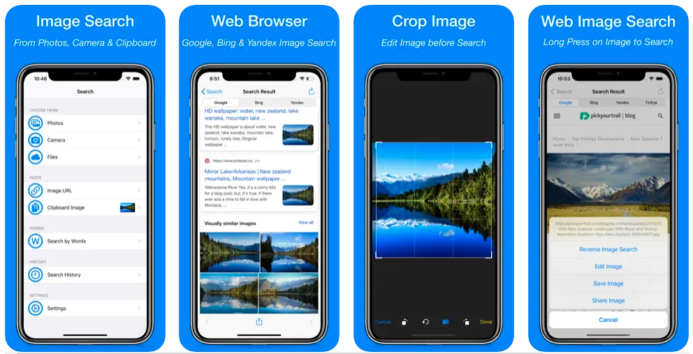 Схожее с предыдущим приложение — для поиска здесь тоже задействуются Google, Яндекс и Bing. Сам поиск можно выполнять по фото из камеры или загруженному из галереи.