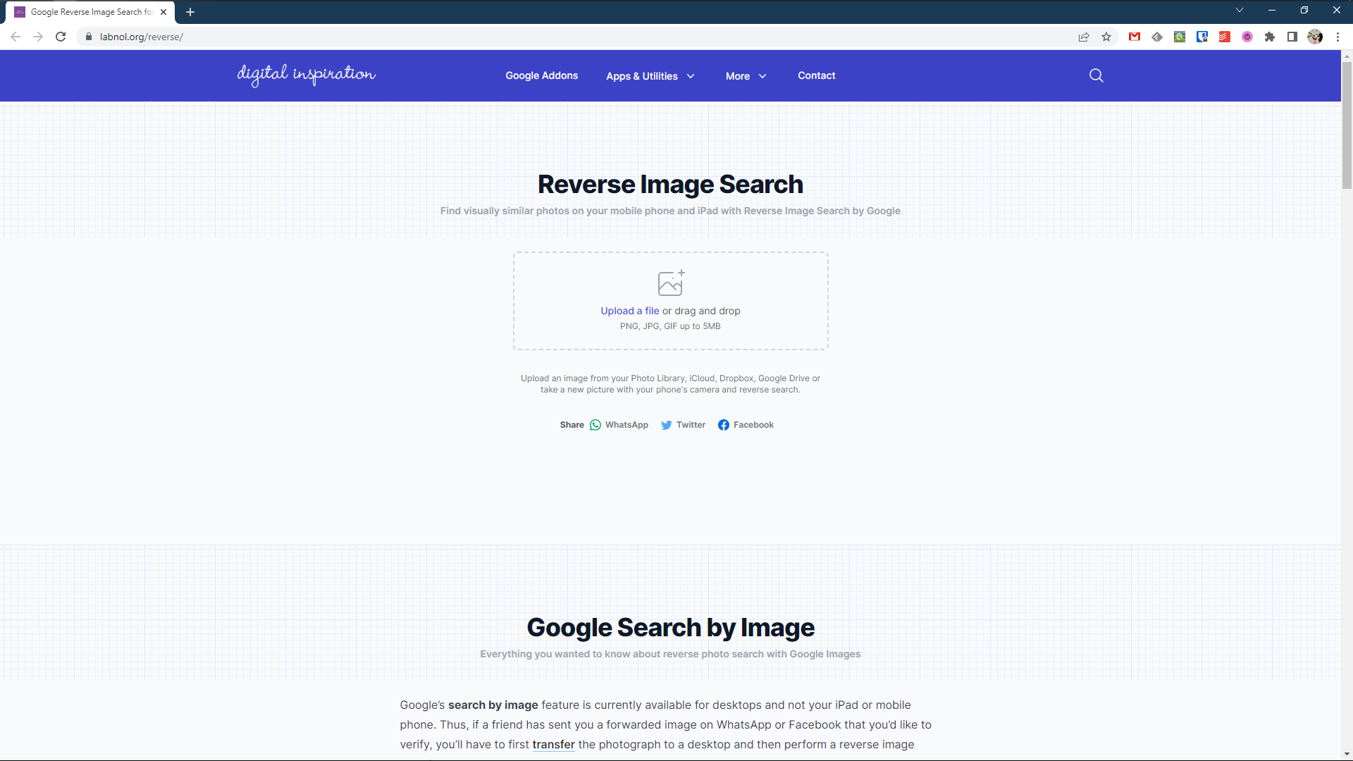 Очень простой сервис обратного поиска изображений. Просто загрузите фото (или перетащите его в окошко), чтобы найти похожие изображения или узнать, что на нём изображено. Единственное «но» — нельзя загрузить фото объёмом более 5 Мб.
