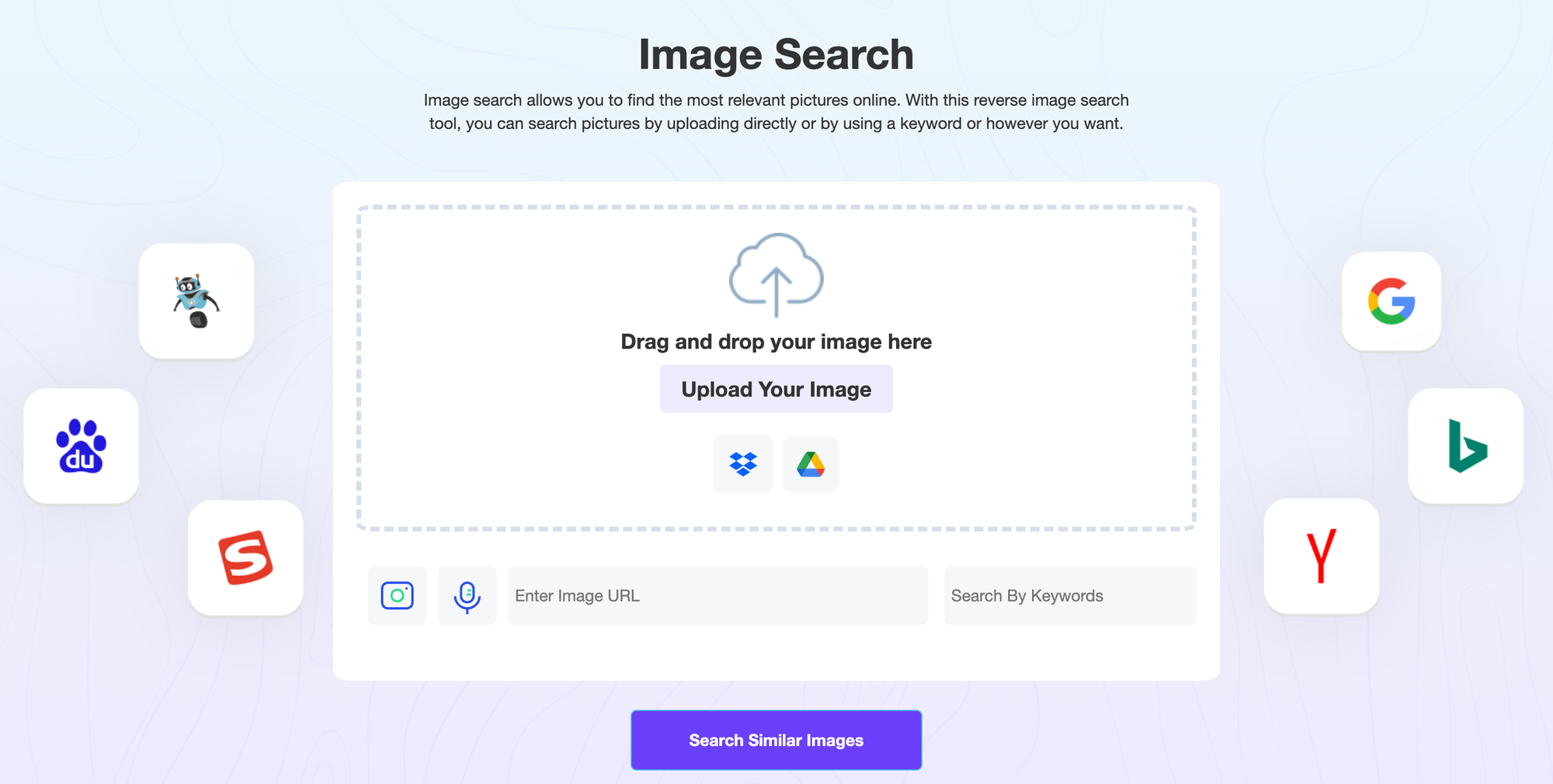 Просто веб-сайт в стиле поиска по картинкам от Google. Вы можете загрузить изображение с ПК, облачного хранилища или просто указать ссылку и начать поиск похожих изображений в сети. При необходимости можно указать ключевые слова.