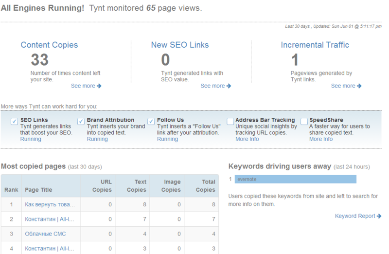Посетители постоянно делятся материалами сайта. Если им понравилась какая-то статья или картинка, они обязательно захотят ими поделиться. Для того, чтобы читателям было удобнее, веб-разработчики встраивают кнопки «Поделиться» к себе на сайт. При этом крайне редко кто-то задумывается о том, что люди иногда делятся какой-то частью статьи: цитатой или картинкой. Они выделяют текст, копируют его и отсылают своим друзьям в ЛС во ВКонтакте или ещё куда-либо. Tynt служит для отслеживания именно такого контента.