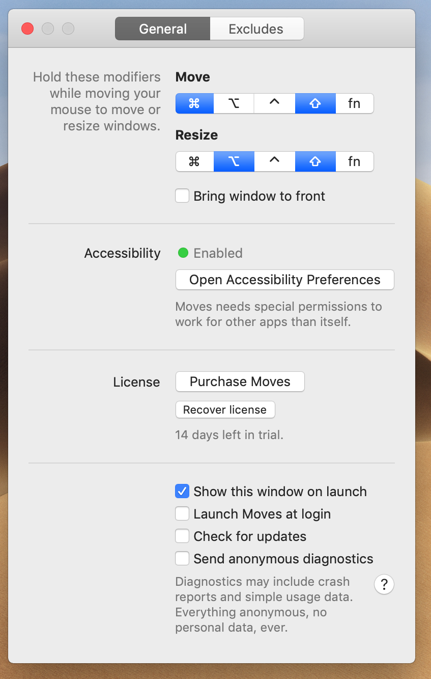 Приложение начинает работать сразу же после установки. При желании в настройках можно поменять горячую клавишу на активацию перемещения или изменения размера окна, а также добавить приложения в исключения.