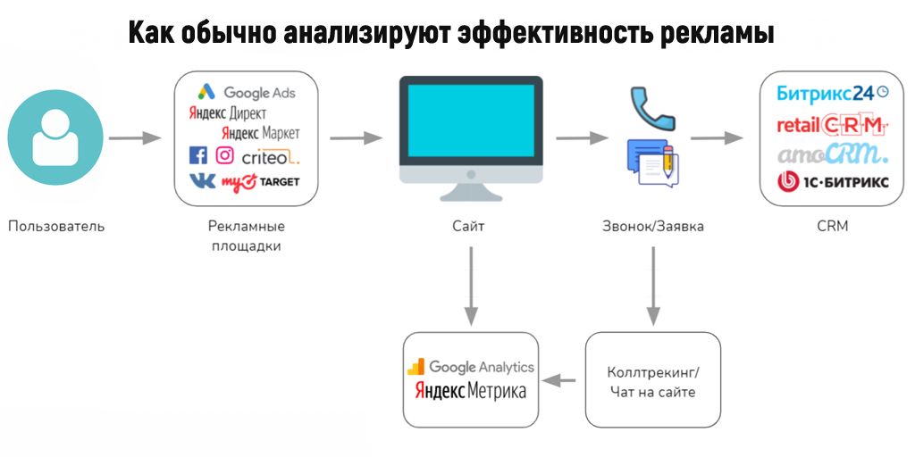 Схема выше показывает, что источники данных очень различаются – здесь и CRM, и рекламные каналы. Если анализировать данные вручную, то все придется сравнивать. К примеру, CRM никак не пересекается с Яндекс.Метрикой. Рекламные площадки же можно проанализировать исключительно инструментами веб-аналитики. К ним относятся Яндекс.Метрика и Google Analytics (GA).