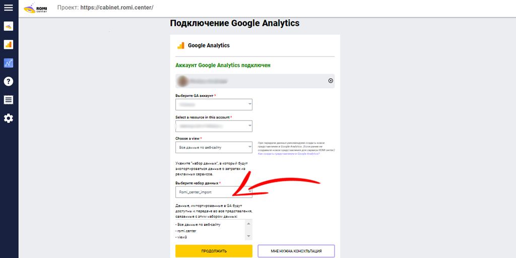 Эти данные нужны, чтобы получить отчетность и обработать данные, которые были собраны в GA. Введите название аккаунта, затем его необходимо подтвердить. После следует указать набор данных, необходимых для анализа. Они будут передаваться из GA, если на вашем сайте настроены код счетчика и критерии набора. К примеру, те же «Заявки» и «Расходы».