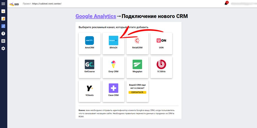 Выберите CRM (к примеру, «Битрикс24»). Нажмите на иконку.