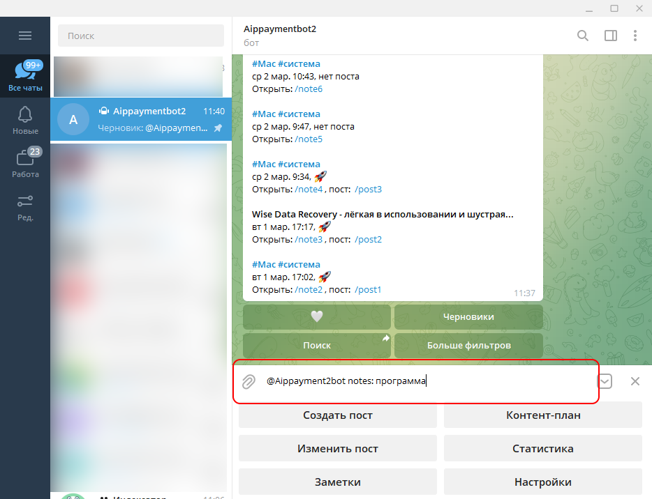 - А кнопка Есть пост отобразит заметки, для которых пост уже опубликован в канале.