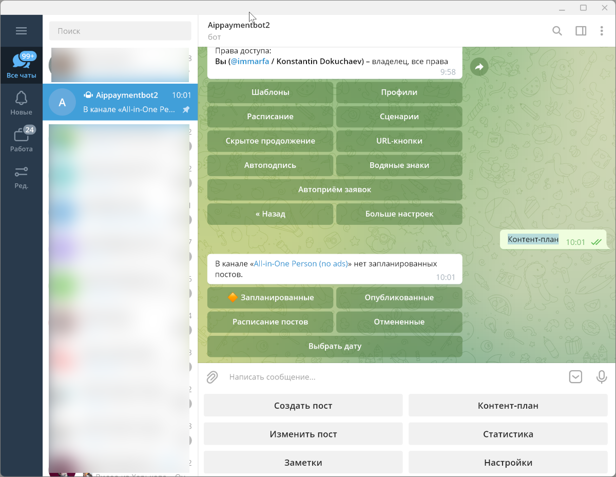 Первый: если вы привыкли всё делать через Telegram, то можно перейти в меню Контент-план и оттуда управлять всеми публикациями.