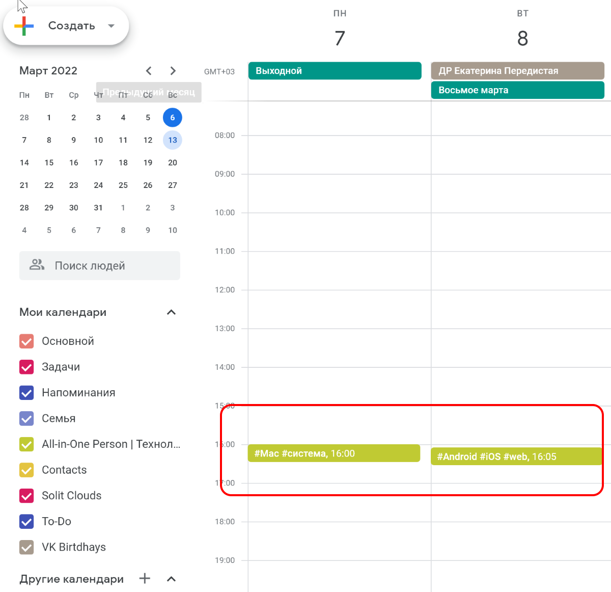 Google Календарь помогает наглядно увидеть запланированные посты и менять время их выхода. Можно быстро понять, до какого числа созданы публикации. Пересекаются ли они по времени, когда есть время для рекламных постов. Легко менять план постов. Если нужно поменять порядок выхода публикаций, можно быстро понять, какие временные промежутки для этого подходят.