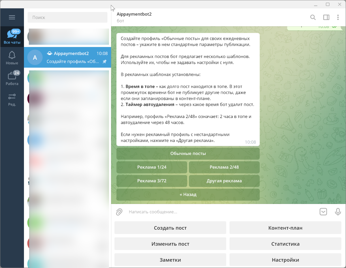 Профили сокращают клики. Когда создаёте новый пост, не надо вбивать вручную все настройки — бот запомнил их. А если надо отправить рекламу, то достаточно нажать на кнопку с названием её профиля.