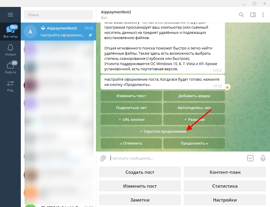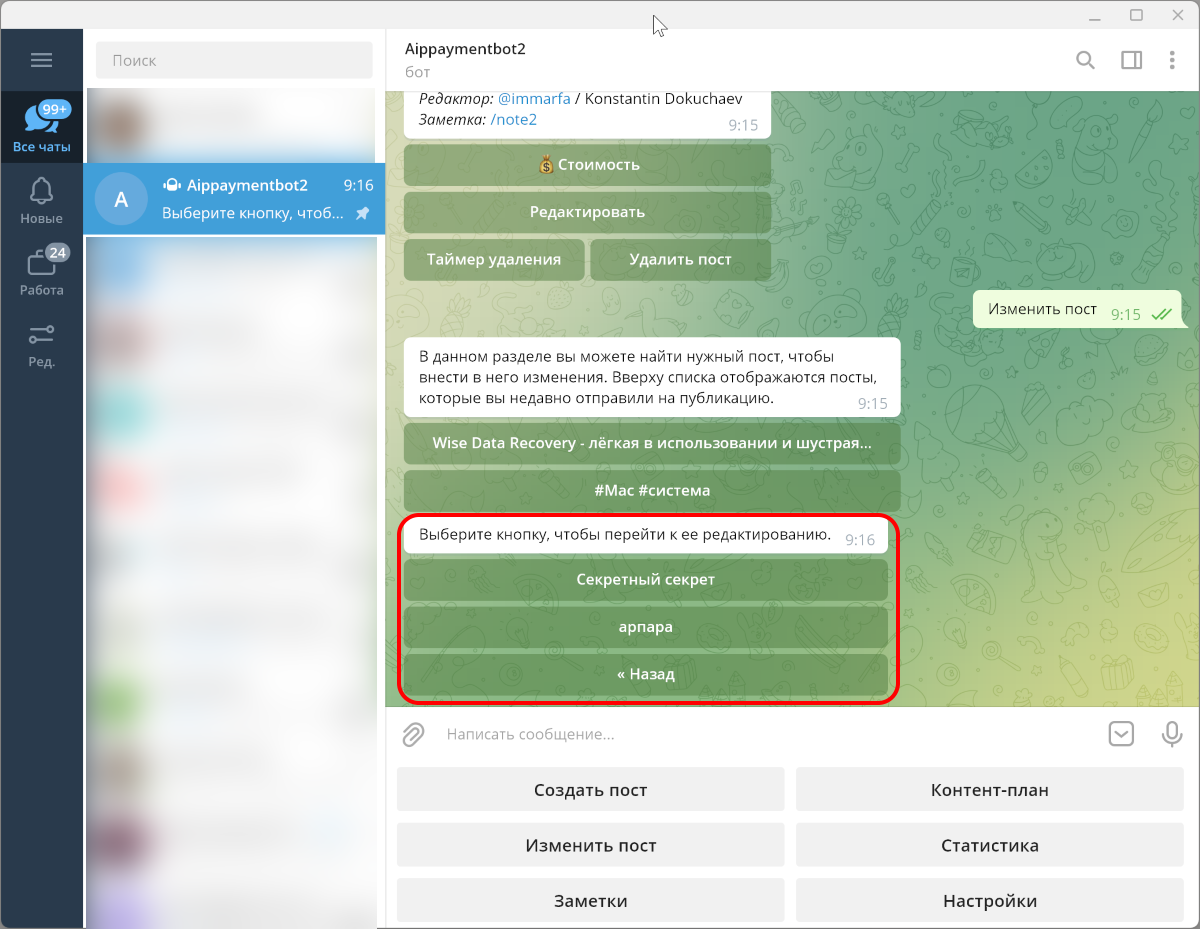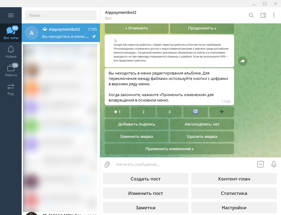 Таким образом, можно легко поменять нужные публикации во всех ваших каналах. При редактировании доступны практически те же возможности, что и при обычной публикации. За исключением нескольких мелочей, которые ограничены самим Telegram.