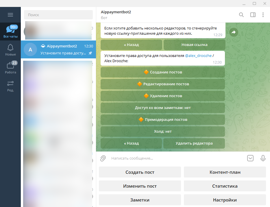 Публикация постов в целом происходит так же, как и в аналогичных ботах. Вы пишете сообщение, которое хотите опубликовать в канале, и отправляете его боту. А фишки заключаются в дополнительных возможностях.