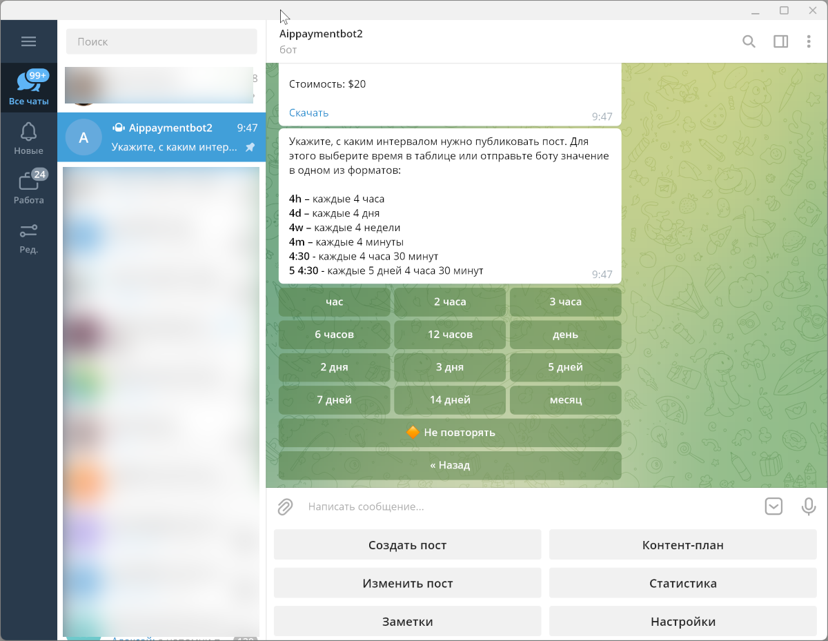 - Расписание постов. Позволяет настроить интервал публикаций в канале. Вам не нужно вручную указывать время выхода постов. Они сами будут занимать ближайший свободный слот.