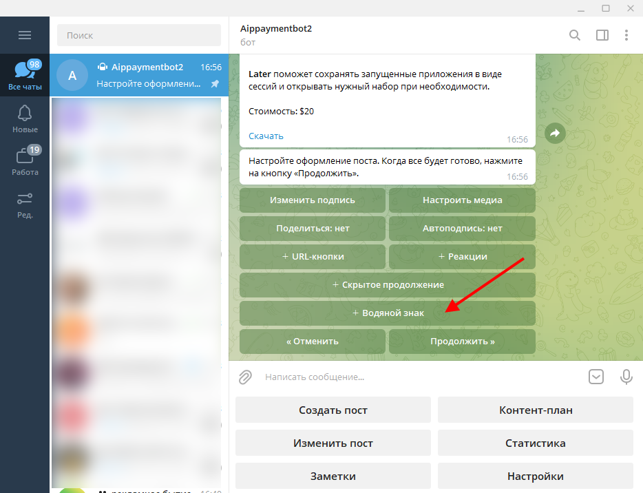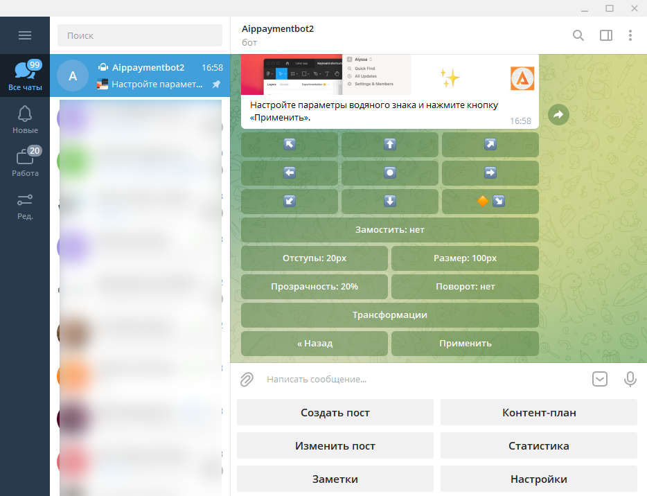 Если ваш пост содержит изображение, видео или прочий медиаконтент, после отправки в Notepost среди опций вы увидите кнопку Водяной знак.