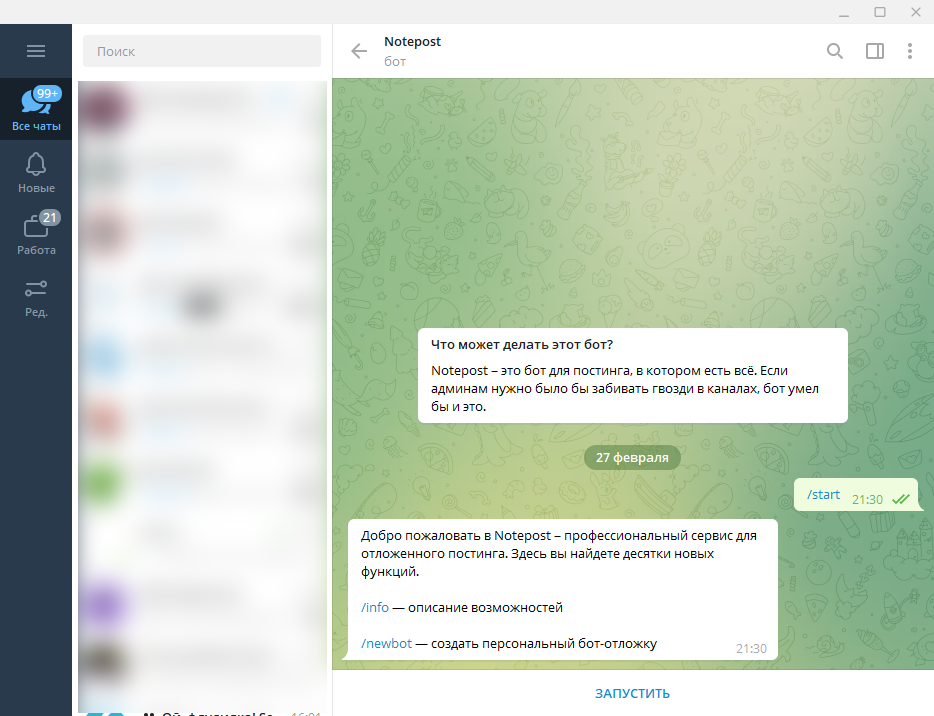 При первом запуске Notepost пользователю потребуется создать своего собственного бота. Это делается через известного в админских кругах бота @BotFather.