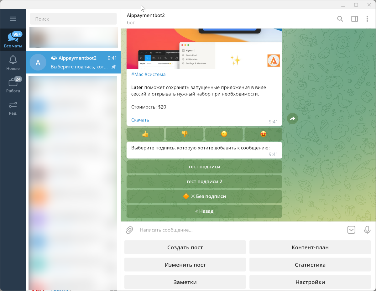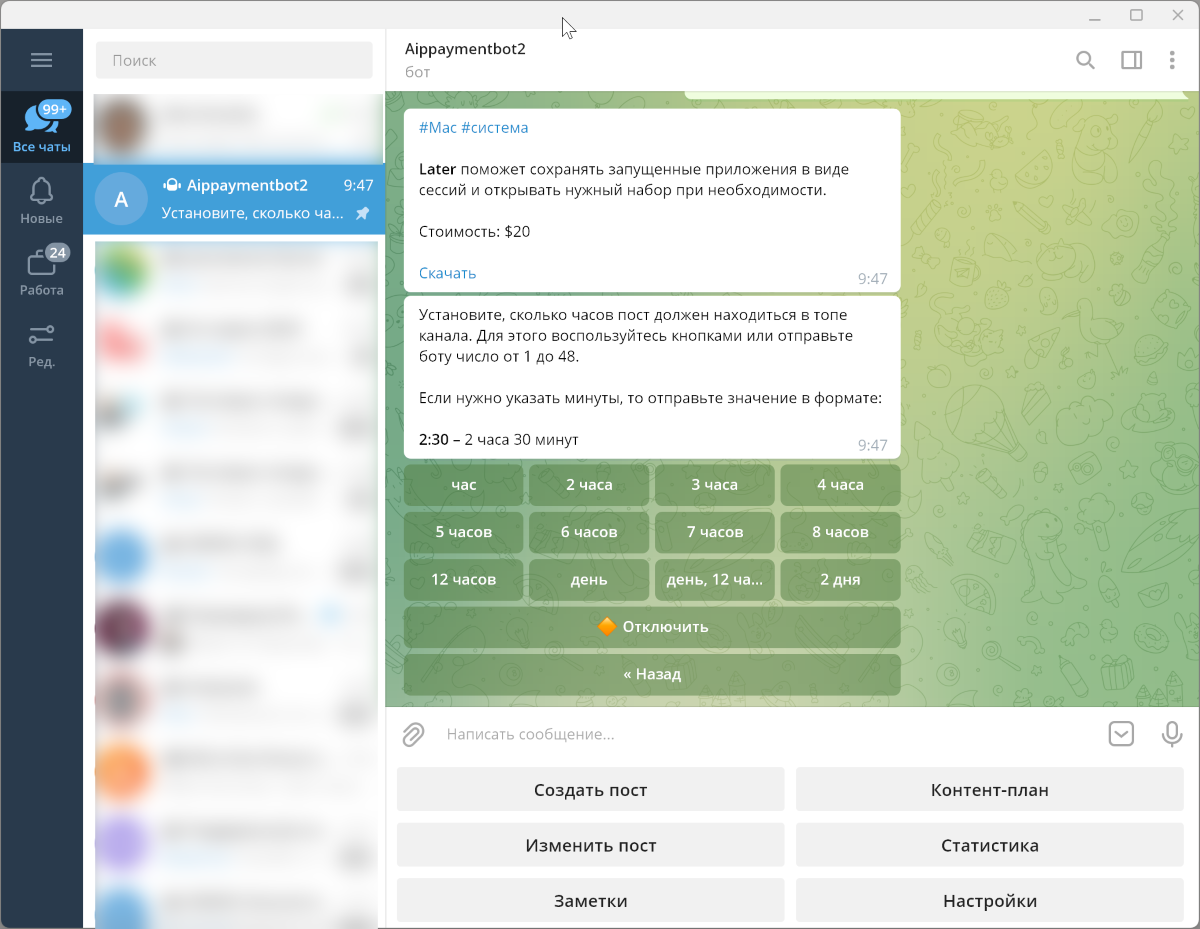 А вот профессиональное использование, с точки зрения администратора Telegram-канала, оставляет желать лучшего. Я сам с удовольствием откладываю сообщения для своих знакомых. Но при подготовке сообщений в канал я всегда пользовался специальными сервисами.