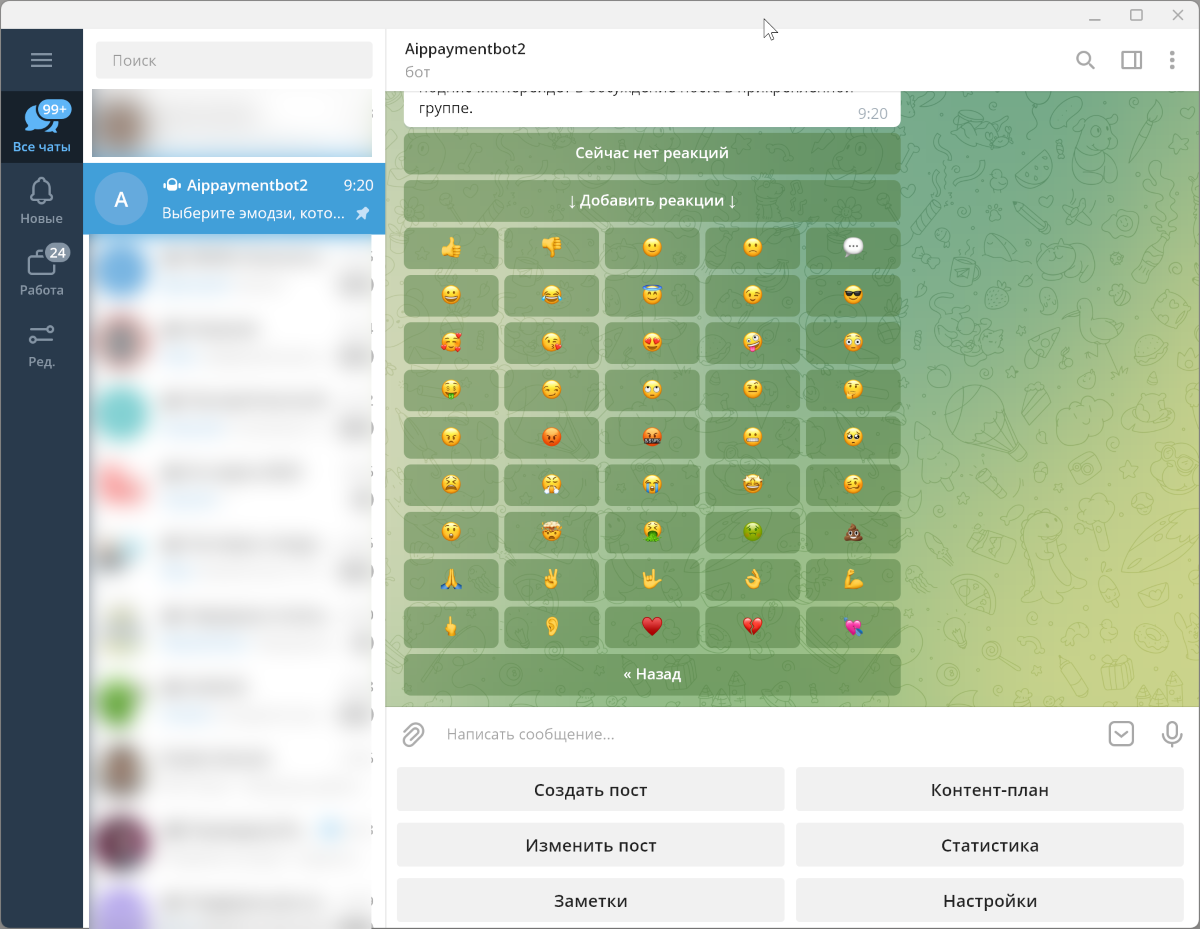 Notepost облегчает процесс добавления реакций к посту. Не надо искать подходящий символ и вручную отправлять его боту. Нажимаете Реакции, и открывается удобная таблица с эмодзи.