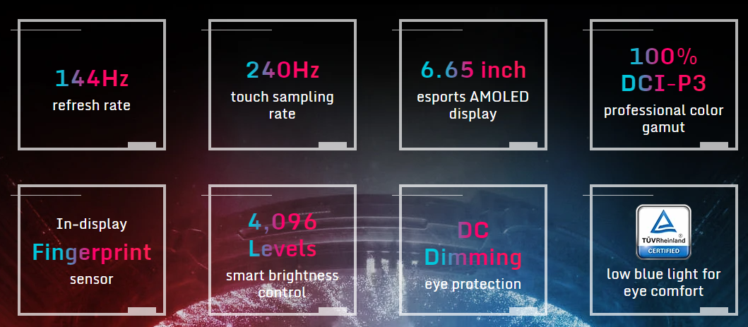 Дисплей смартфона специально разработан для доставки графона в твои глаза. Кроме частоты обновления в 144HZ, в нём улучшена скорость реакции на нажатия (сенсорный слой с частотой обновления 240 Гц), цветопередача и не забыли о защите зрения.